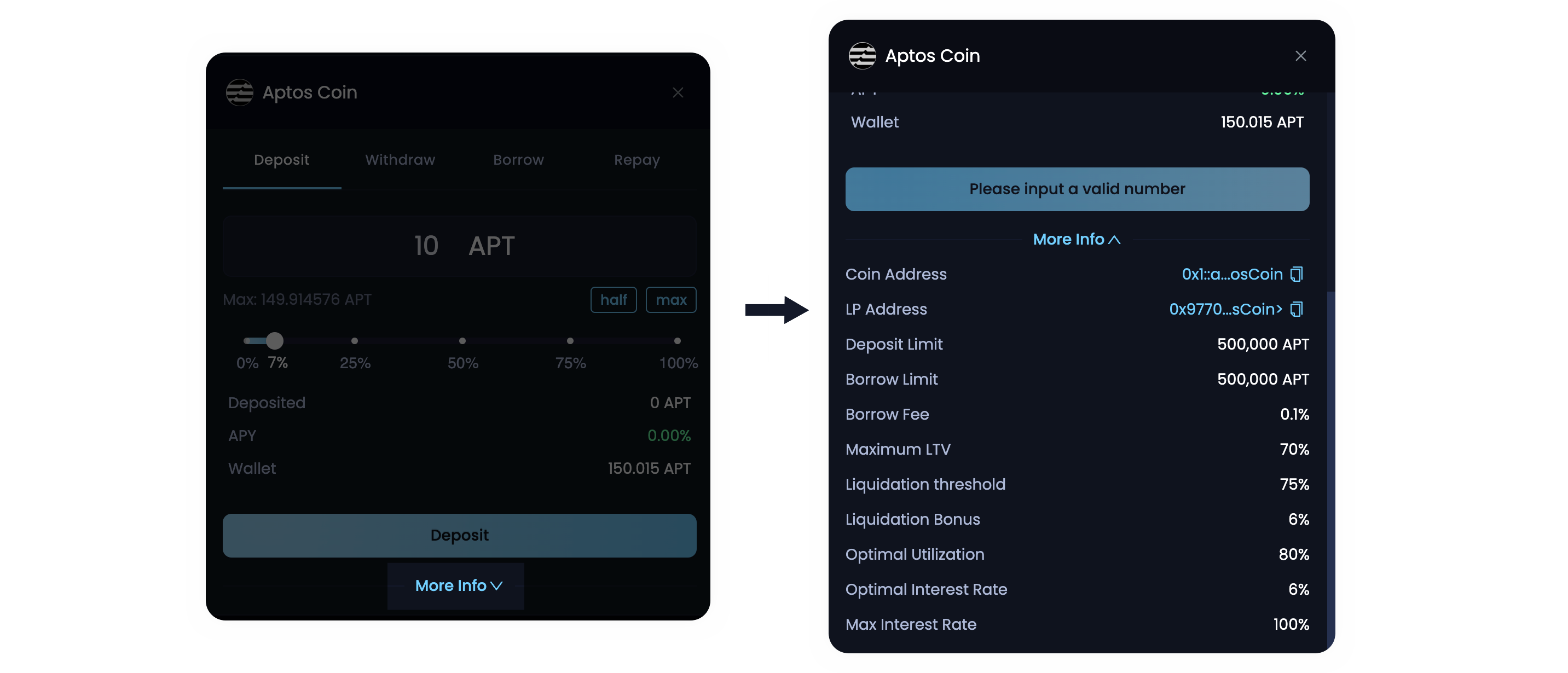 <table><thead><tr><th width="139">Assets</th><th width="107">Collateral Factor</th><th width="217">Liquidation Threshold</th><th>Borrow Factor</th></tr></thead><tbody><tr><td>USDT</td><td>0.8</td><td>0.85</td><td>1</td></tr><tr><td>zUSDC</td><td>0.8</td><td>0.85</td><td>1</td></tr><tr><td>APT</td><td>0.70</td><td>0.75</td><td>1</td></tr><tr><td>WETH</td><td>0.70</td><td>0.75</td><td>0.85</td></tr><tr><td>zWETH</td><td>0.70</td><td>0.75</td><td>0.85</td></tr><tr><td>stAPT</td><td>0.65</td><td>0.70</td><td>0.8</td></tr><tr><td>zwBTC</td><td>0.6</td><td>0.65</td><td>0.8</td></tr><tr><td>CAKE</td><td>0.5</td><td>0.55</td><td>0.8</td></tr><tr><td>amAPT</td><td>0.4</td><td>0.45</td><td>1</td></tr><tr><td>USDY</td><td>0</td><td>0.72</td><td>1</td></tr><tr><td>wUSDC</td><td>0.8</td><td>0.85</td><td>1</td></tr><tr><td>SOL</td><td>0</td><td>0.65</td><td>1</td></tr><tr><td>tAPT</td><td>0</td><td>0.65</td><td>0.8</td></tr></tbody></table>